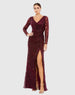 Sequined lace long-sleeve evening gown with flattering ruching at the waist and a thigh-high slit.