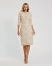This elegant boucle fabric dress features stylish patch pockets with delicate beaded trim, adding a touch of glamour. The high neckline and 3/4 sleeves create a refined silhouette, while the floral gold buttons offer a unique, chic detail. Perfect for daytime formal or semi-formal occasions, this dress seamlessly blends classic style with modern embellishments, making it a timeless addition to your wardrobe.