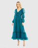 Crafted with a delicate chiffon overlay, this A-line dress boasts a flattering v-neckline and long puff tiered sleeves. The pleated cummerbund adds a touch of elegance while the ruffle tiered skirt creates a feminine silhouette. Perfect for any special occasion.
