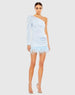 This bold mini dress features a single long sleeve, ruched waist detailing, and a playful feather hem.