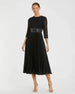 Elegant 3/4 sleeve a-line midi dress with a pleated tea-length skirt, round neckline, and a dramatic embellished waistband.
